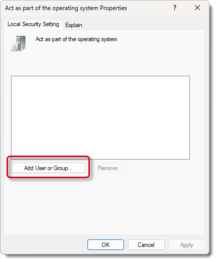 - The Act as part of the operating system dialog box appears. Select the Add User or Group button.