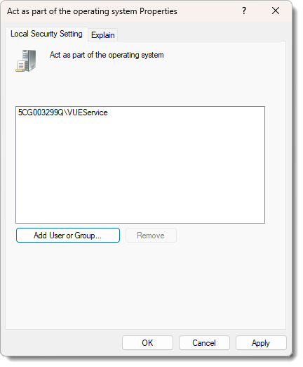 - The service name appears in the list. Select OK to close the Act as part of the operating system Properties dialog box.