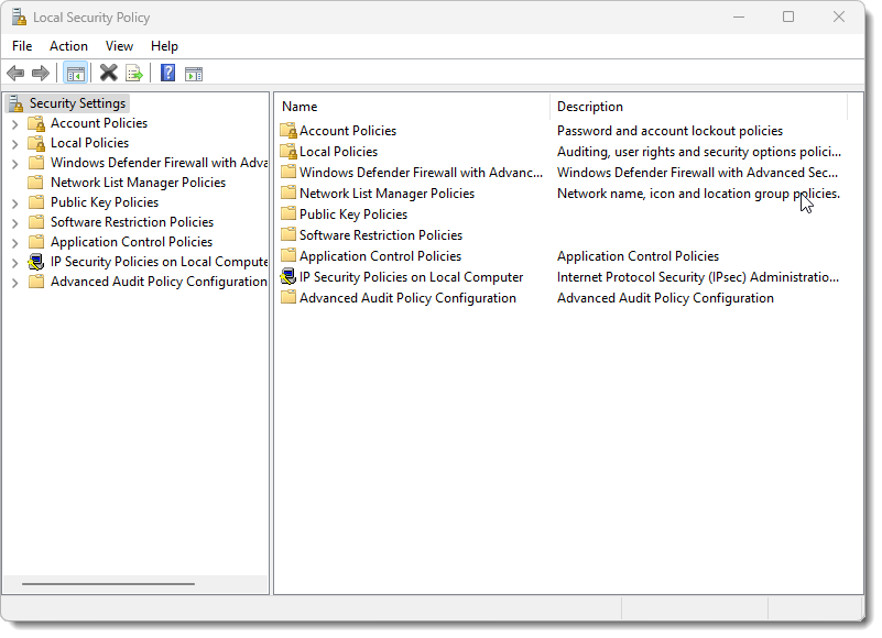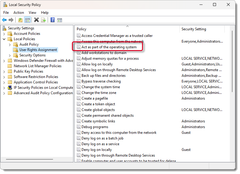 - Expand the Local Policies folder in the left pane, and then select the User Rights Assignment folder.