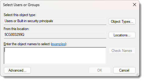 - Select the Advanced button in the Select Users or Groups dialog box.