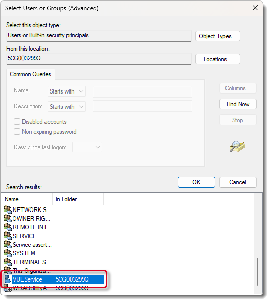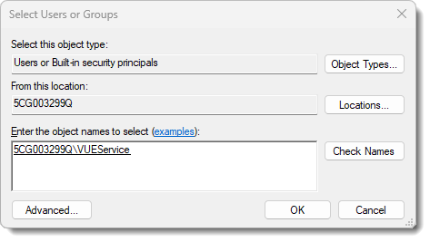 - Select the VUEService account or the account you created in the Create account and assign administrator permissions topic. Select OK.