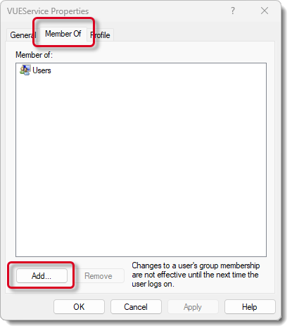 - In the VUEService Properties dialog box that appears, select the Member Of tab. Then select the Add button.