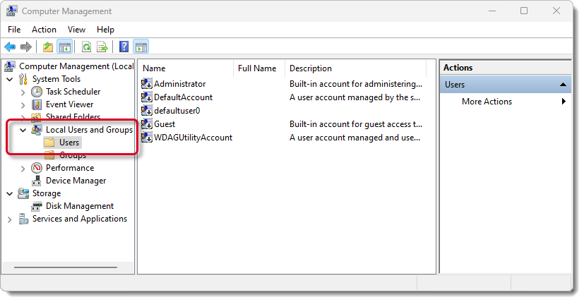 - In the left pane, expand the Local Users and Groups folder. Then right-click the Users folder and choose New User from the pop-up menu.
