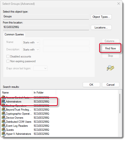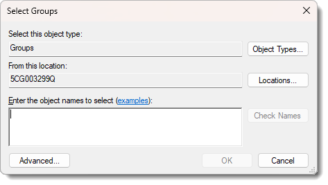 - The Select Groups dialog box appears. You must ensure that you are pointing to the local workstation. Select the Locations button.