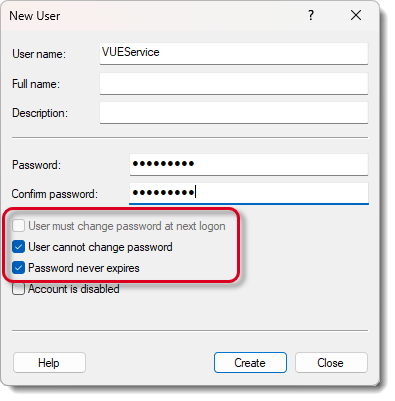 - Type a name for the service in the User name field. The default name is VUEService. We suggest you keep the default name.