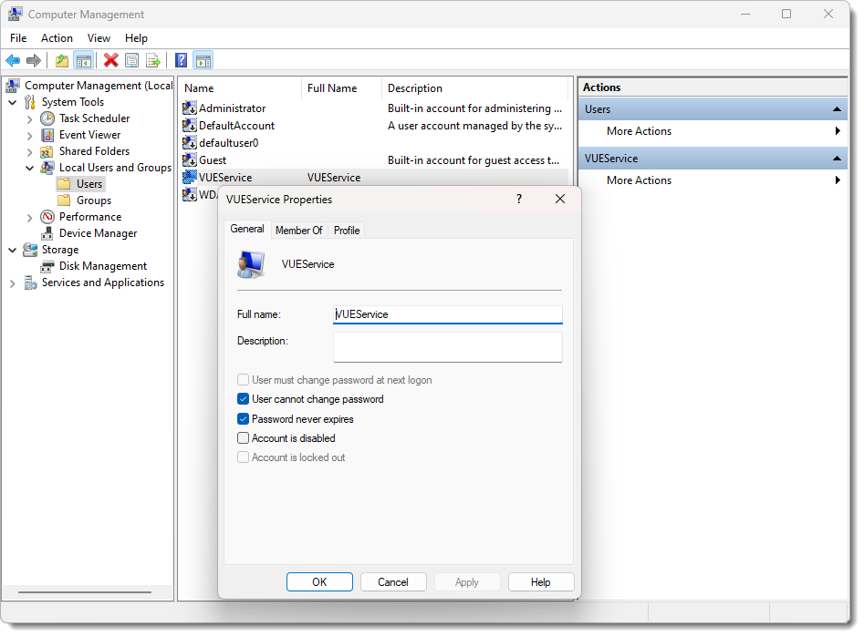 - Double-click the VUEService account (or the account name you created above) listed in the middle pane of the Computer Management dialog box.