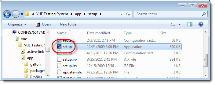 - Open the VUE Testing System directory and find the \app\setup sub-directory. Double-click the setup.exe file in that folder.