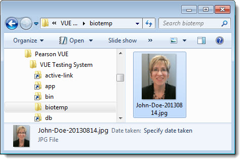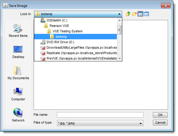 - The Save Image dialog box opens to the Pearson VUE\VUE Testing System\biotemp directory. Enter the Candidate’s first name, last name, and date so the file has a unique name. Do not include spaces in the name; use hyphens or underscores instead.