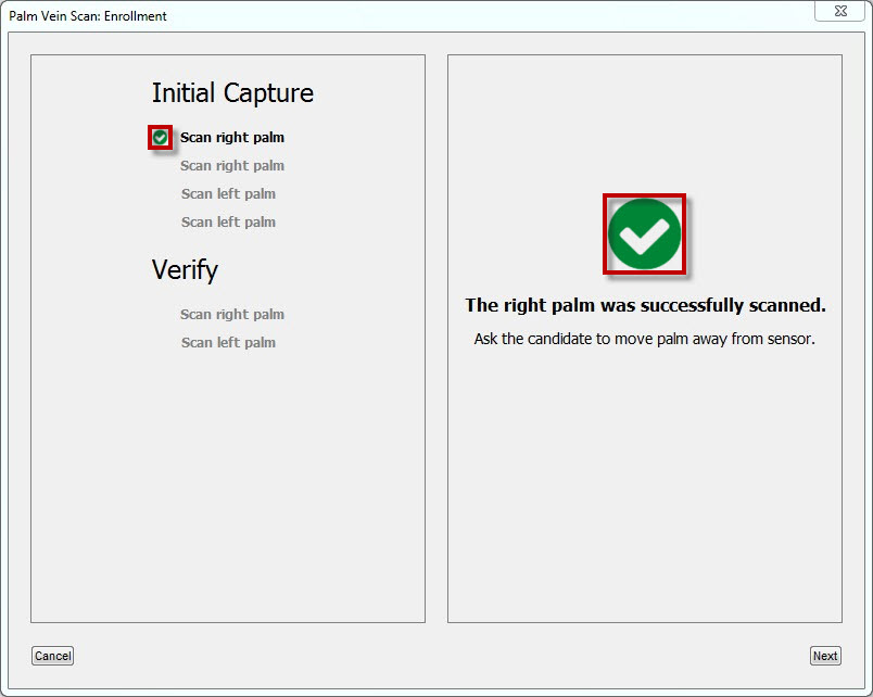 After the candidate's right palm vein is verified, a check mark appears next to the third instance of "Scan right palm" in the left pane and above the text in the right pane of the Palm Vein Scan: Enrollment window.